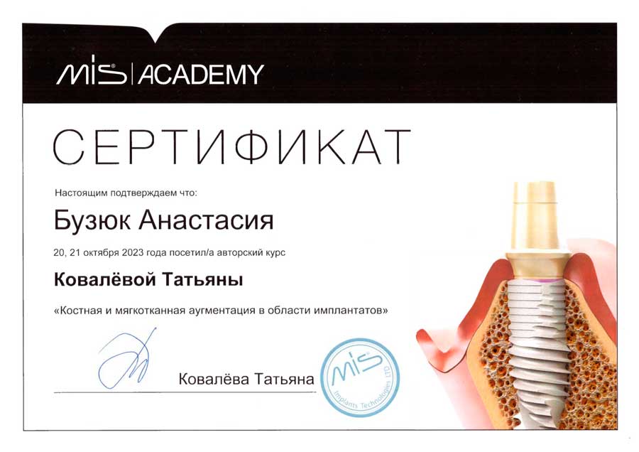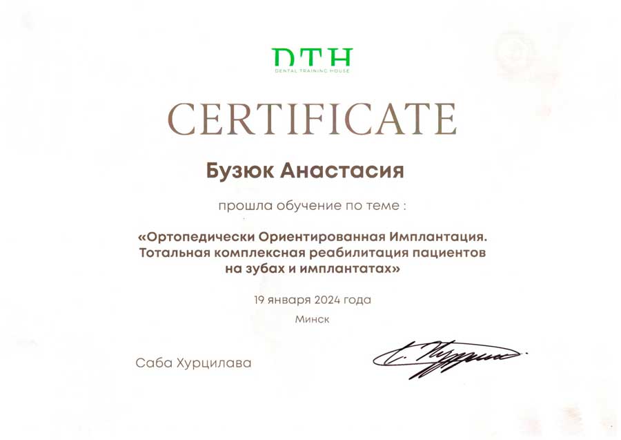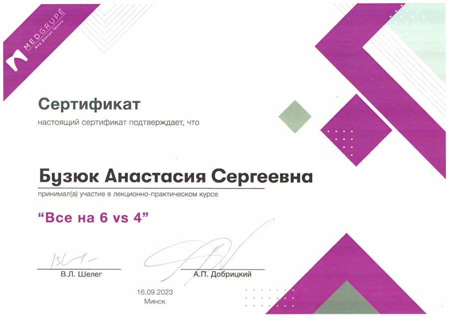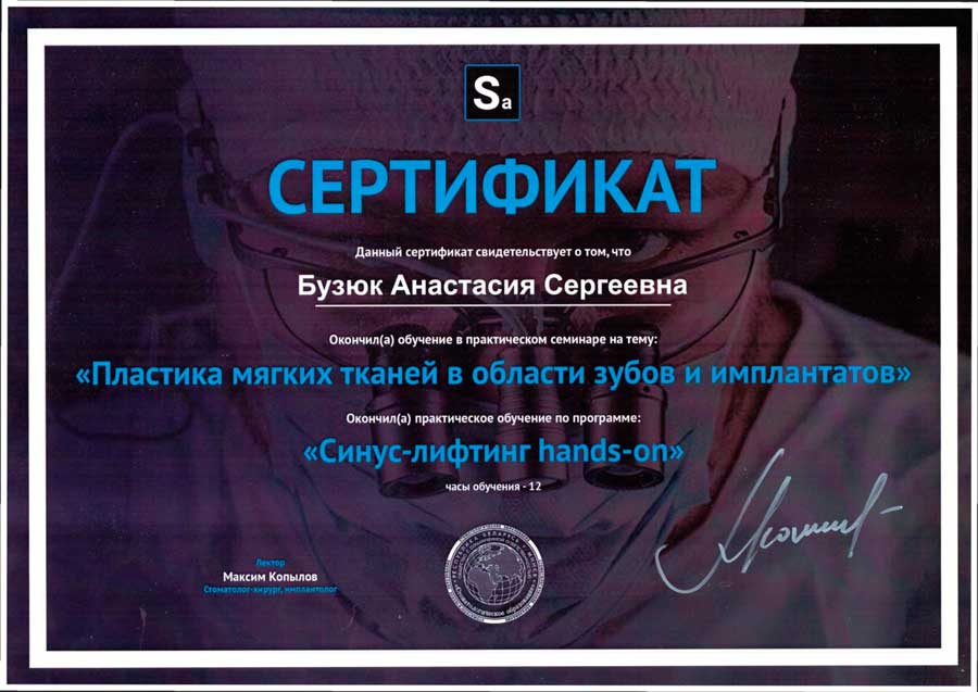 Выражаю огромную благодарность хирургу Бузюк Анастасии Сергеевне за высокий уровень профессионализма, четкости и помощи в удалении сложного зуба. А также спасибо отдельное замечательному администратору, которая нашла мне место срочно к врачу и в целом медицинскому персоналу. Клиника и ее доктора работают на высоком уровне!! Удачи и процветания Вам.