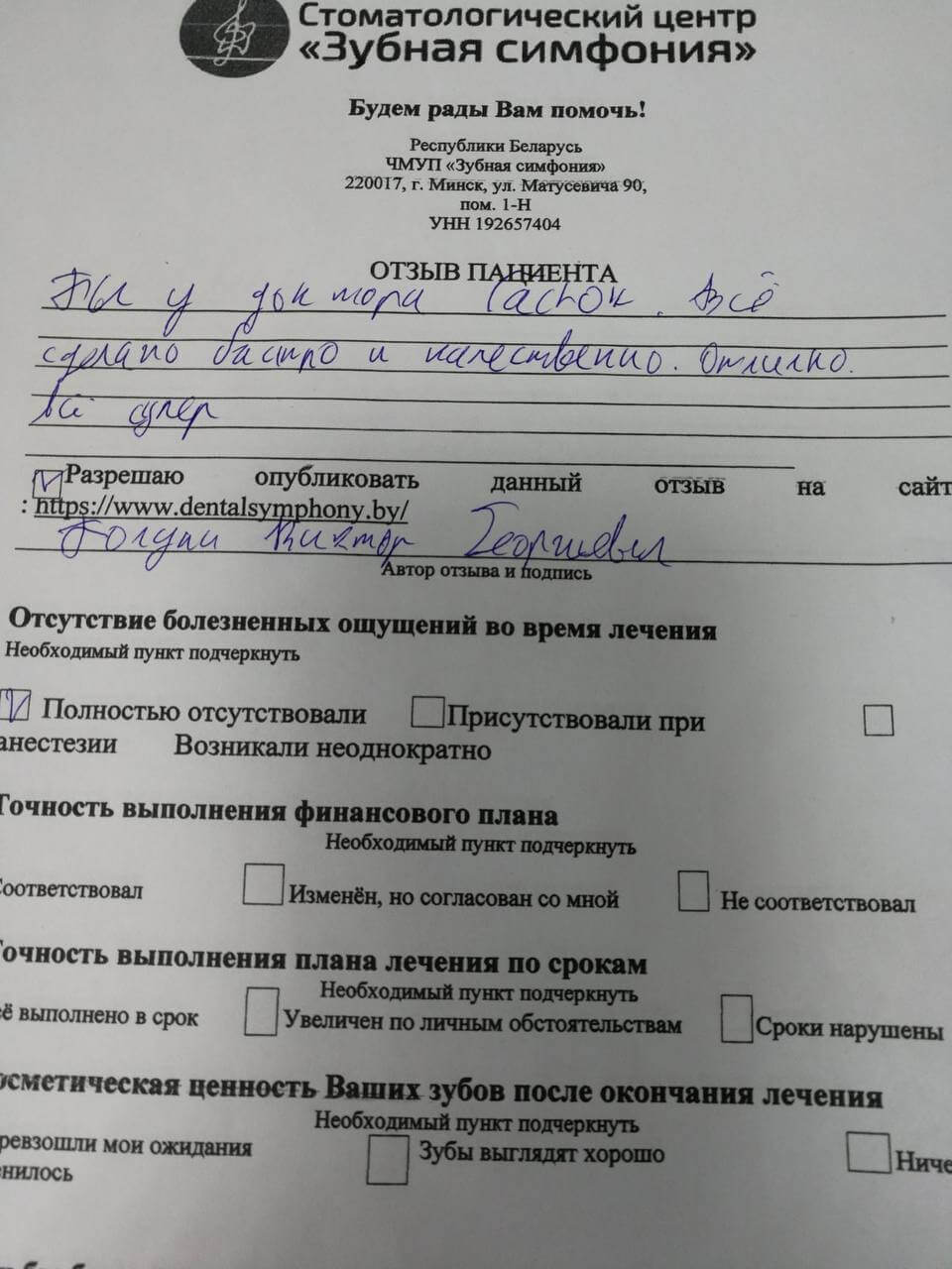 Всем доброго дня! Хочу поделится своим положительным опытом посещения стоматологии Зубная Симфония. С детства, думаю, как и многие, боюсь зубных врачей. Поэтому мои визиты к ним нерегулярны и лишь по острой необходимости - пока ничего не беспокоит ни за что не пойду. Теперь я понимаю, что это очень даже зря!! Лучше, как советуют стоматологи, ходить на профосмотры хотя бы раз в год! А не сидеть и ждать, пока прижмет как в моем случае. А мой случай такой - не была у стоматолога уже более 5 лет, ничего и не беспокоило, но как оказалось, кариес бывает и скрытый, и пока он не дойдет до корня зуба, болеть ничего и не будет. Вот и я затянула с лечением и пришла уже только по острой боли. В результате один зуб уже спасти не удалось - пришлось ставить коронку. И еще три вылечили. Но я попала к замечательным врачам - Даревскому Андрею и Гасюк Ирине. С ними - лечить зубы не страшно! Большое вам спасибо за проделанную работу и за то, что избавили меня от страха перед стоматологами!